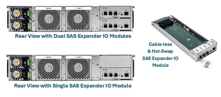 - Single or Dual 12G SAS Expander IO Modules – Hot-Swappable & Daisy-Chainable.