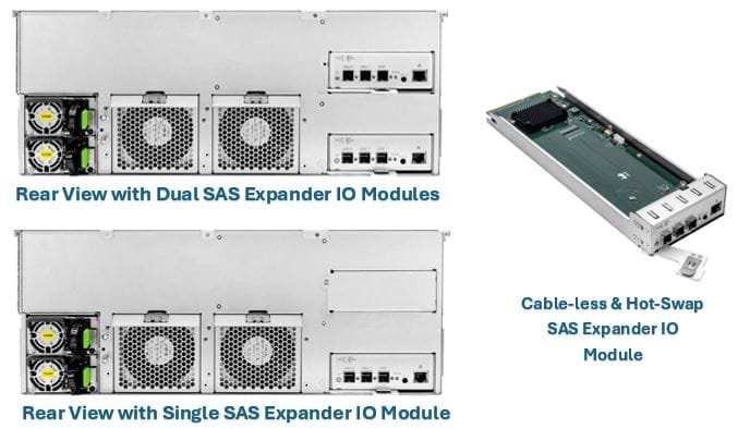 - Single or Dual 12G SAS Expander IO Modules – Hot-Swappable & Daisy-Chainable.